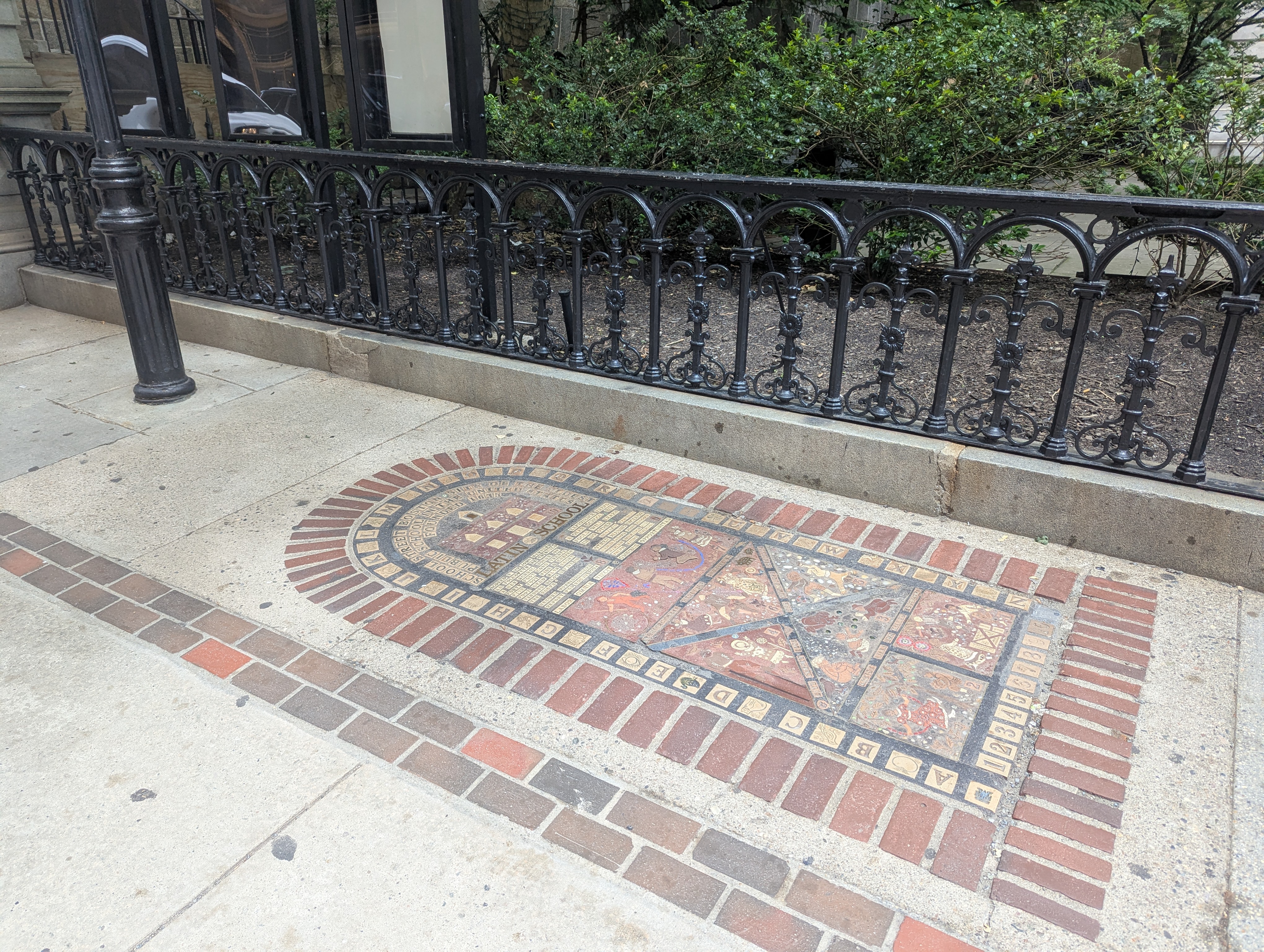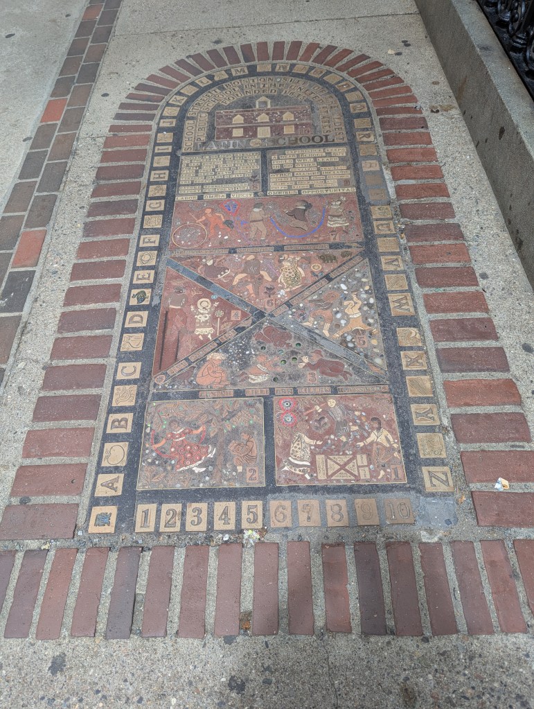 The mosaic is titled “City Carpet” and was installed in 1983. Roughly in the shape of a hopscotch diagram, it depicts images of children playing various playground games and an inscription commemorating the Boston Latin School. (Which is still in existence — now located at 78 Avenue Louis Pasteur, just south of Fenway Park, offering the high standards of a traditional New England prep school with the free admission of a public school. Good grades and a Boston residency are the qualifications for admittance, and yes, learning Latin remains a requirement for graduation.)