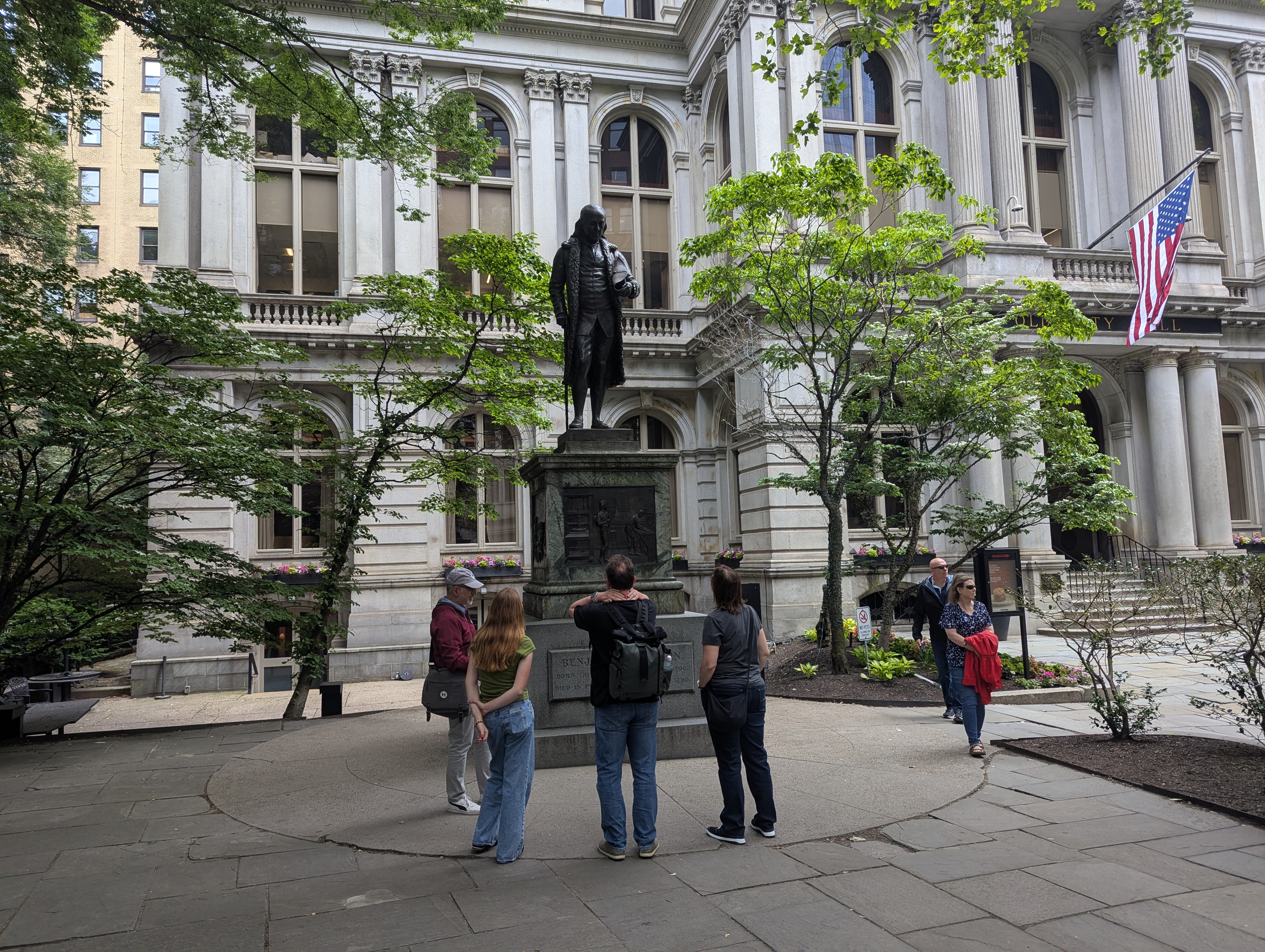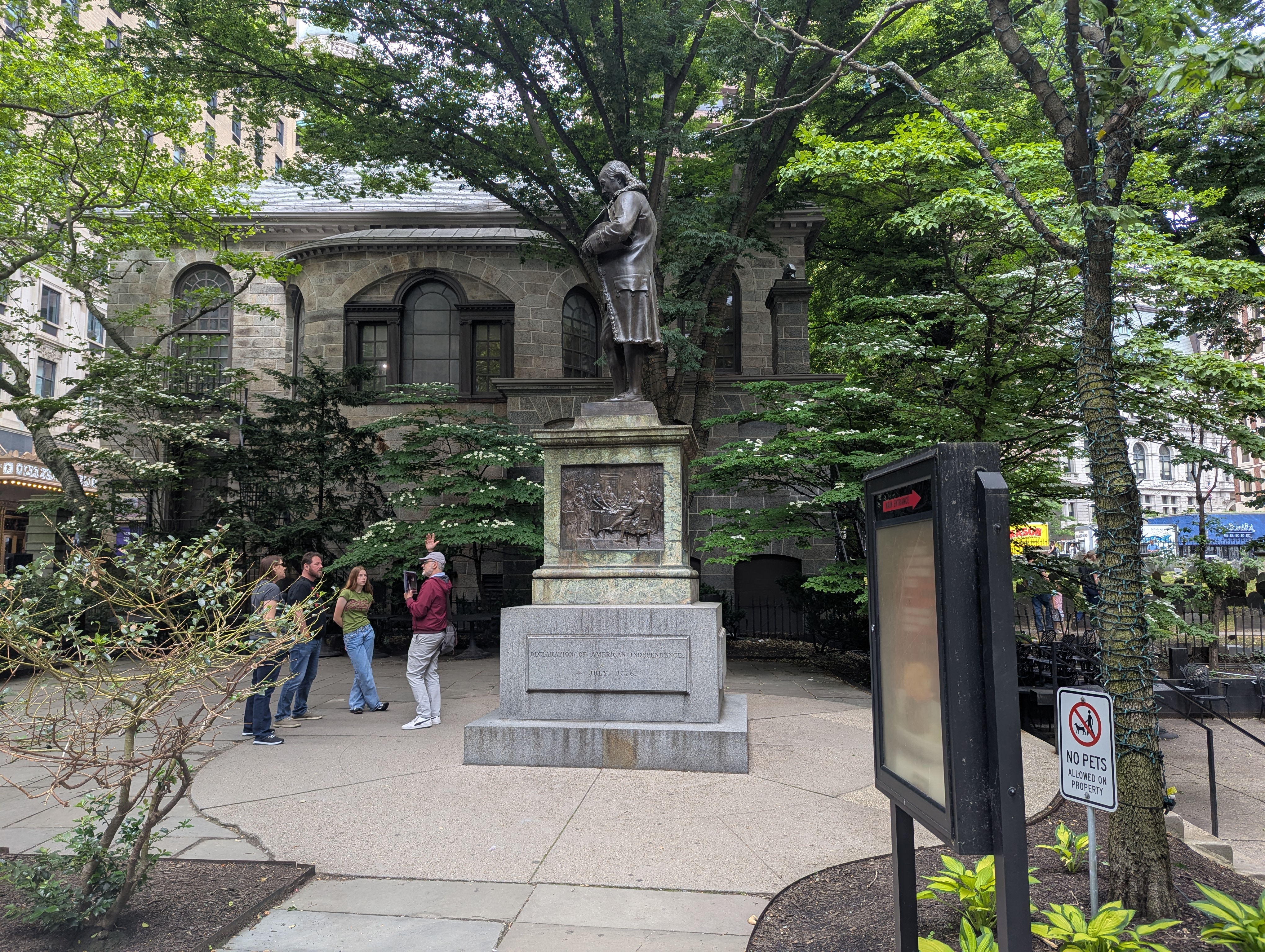 Turning off Tremont Street and heading up School Street, we soon came upon the source of the street’s name. #6, Boston Latin School. Boston, as we’ve seen, is a city of “firsts.” Here we have the first public school in the United States, dating from before there even was a “United States.” It was public in the sense that it was free for students, funded by community donations and land rentals rather than traditional taxes. Rich or poor could attend, as long as they were a) male, and b) white. (The school graduated its first Black student in 1862, and only accepted girls beginning in 1972.)
