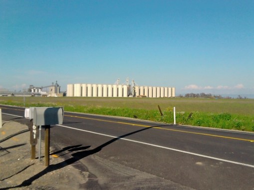 We then began a 45-minute discussion of how our first video should look. In one of our nocturnal countryside cruising sessions, we had already ran across a perfect location — a set of grain elevators out in Sutter, a small(er) farming town about seven miles away. From a distance, they looked like a gigantic pack of twenty-four ounce beer cans. Up close, at night, they looked like a whirring, hissing, Gilliam-esque industrial futuristic nightmare-scape. All color washed away against the towering white silos floodlit by powerful flourescents. How cool would it look to set up band gear and rock out with all this as a backdrop? Security at the place was clearly minimal/non-existent as we had already paid it a night-time visit or two. In fact, it was clear we could simply back up a truckload of gear and film our video till the wee hours.